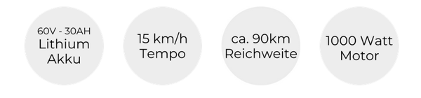 Ausgestattet mit dem 1000W Motor erreicht das Elektromobil eine Reichweite von ca. 90KM. Das Aufladen erfolgt über das Ladegerät an einer haushaltsüblichen 230V Steckdose. Damit ist es ein ideales und kostengünstiges Beförderungsmittel für den Nahbereich.