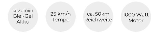 Ausgestattet mit 60V-20AH Blei-Gel Akkus erreicht das Elektromobil eine Reichweite von ca. 50 KM. Das Aufladen erfolgt über das Ladegerät an einer haushaltsüblichen 230V Steckdose. Damit ist es ein ideales und kostengünstiges Beförderungsmittel für den Nahbereich.