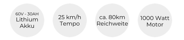 Ausgestattet mit dem 1000W Motor erreicht das Elektromobil eine Reichweite von ca. 80 KM. Das Aufladen erfolgt über das Ladegerät an einer haushaltsüblichen 230V Steckdose. Damit ist es ein ideales und kostengünstiges Beförderungsmittel für den Nahbereich.